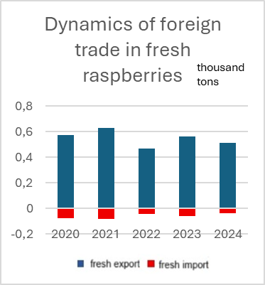 Fresh raspberry exports have suffered more due to their smaller volumes and higher sensitivity to market fluctuations. The main importers remain Poland and the Netherlands. Since raspberry imports mainly consist of premium varieties, and demand for them has decreased, imports have declined and remain at a lower level. The main exporters to Ukraine are Spain and Morocco.