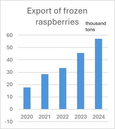 Exports of frozen raspberries continue to grow steadily — by 10 thousand tons annually. The main importers are Poland (40%) and Germany (30%), the latter of which doubled imports in 2023 and tripled them in 2024 compared to 2022. Belgium, Austria, Italy, and France have also increased their imports. Imports in this category remain insignificant.