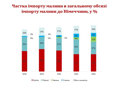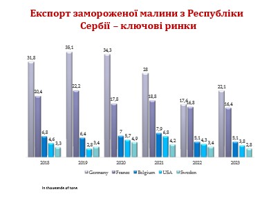 Експорт замороженої малини залишається фундаментом сербської галузі. Країни ЄС, зокрема Німеччина, є ключовими ринками збуту, а частка сербської малини в їхньому імпорті слугує індикатором конкурентоспроможності сектору.