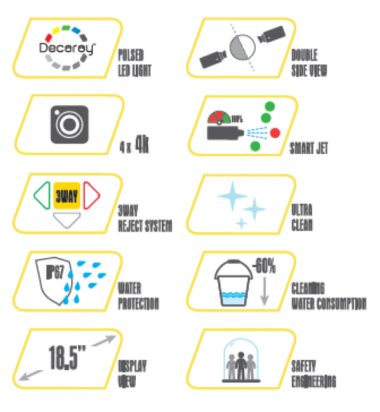 Технологія Decaray – це поєднання в одній машині всіх можливих сортувальних технологій, в тому числі аналіз прозорості і аналіз хлорофілу.